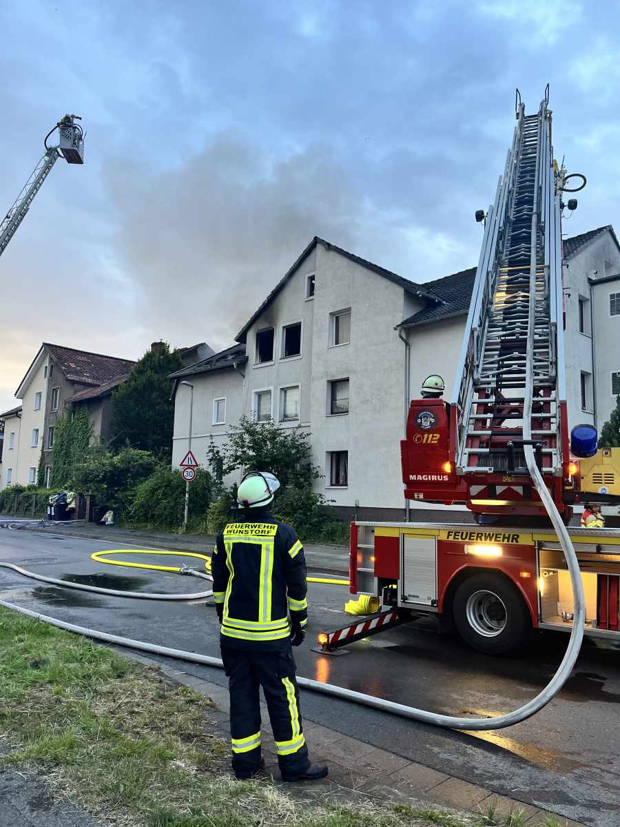 Bei einem Dachstuhlbrand in einem Mehrfamilienhaus ist eine Wohnung im Dachgeschoss vollständig ausgebrannt. Bei dem Einsatz kamen zwei Menschen ums Leben und wurden nur noch tot in der Brandwohnung aufgefunden.